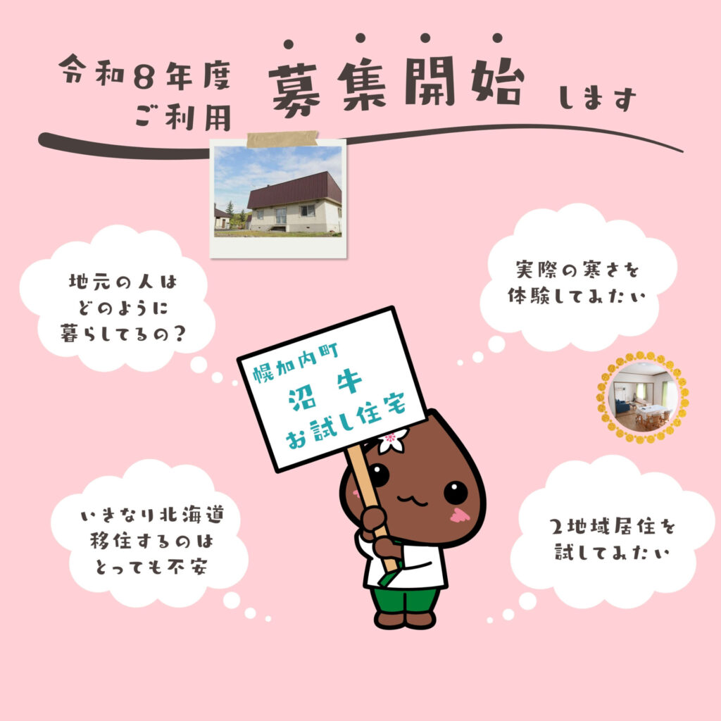 こんにちは、幌加内町担い手確保対策協議会事務局です。幌加内町への移住を検討されている方に向けて、令和8年度 お試し住宅(沼牛)の利用申込受付を開始いたします! …