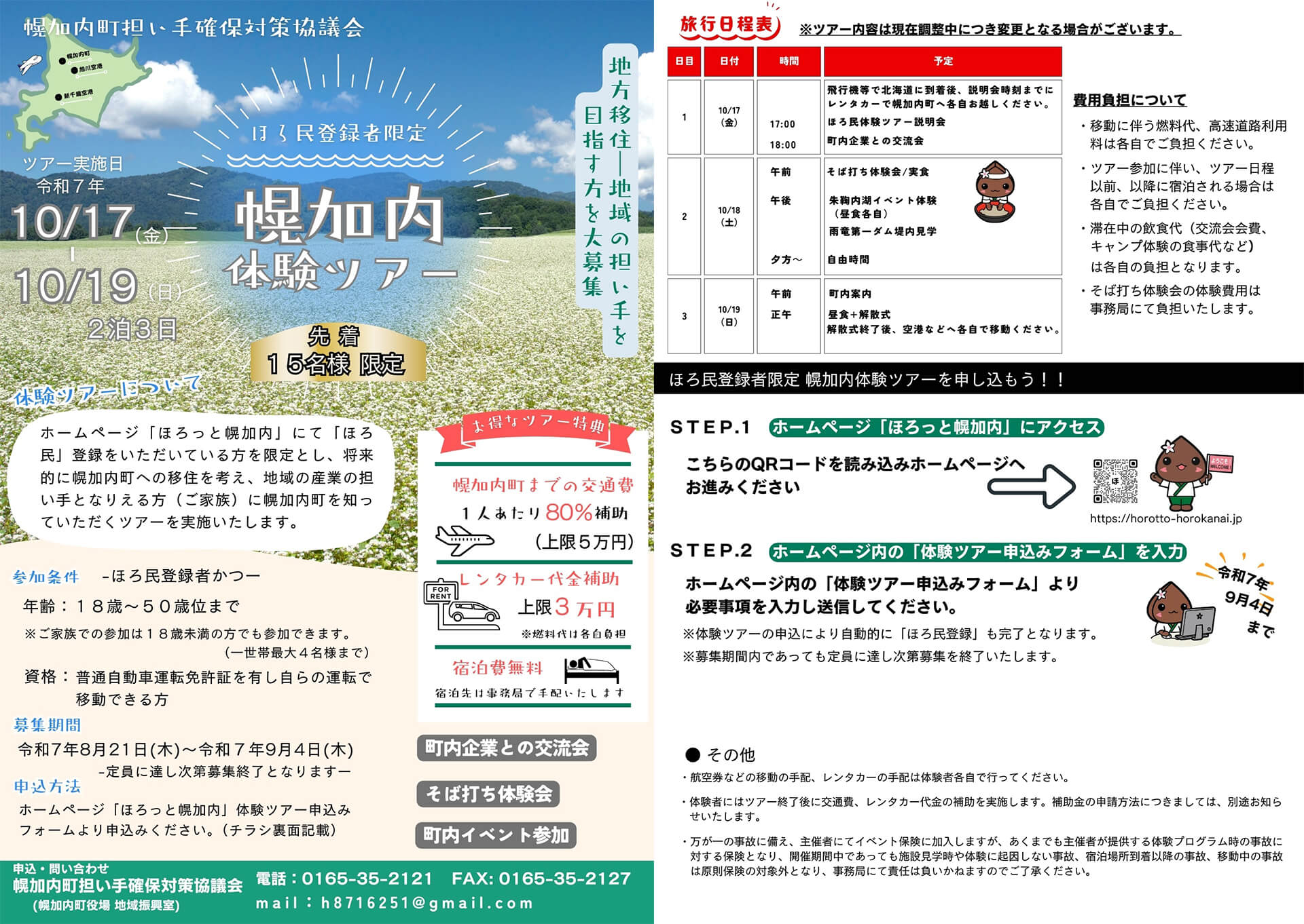 「ほろ民」ご登録をいただいている方を限定とし、将来的に幌加内町への移住を考え、地域の産業の担い手となりえる方(ご家族)に幌加内町を知っていただくツアーを実施いたします!先着15名様限定ですので、お早めにお申し込みください。
